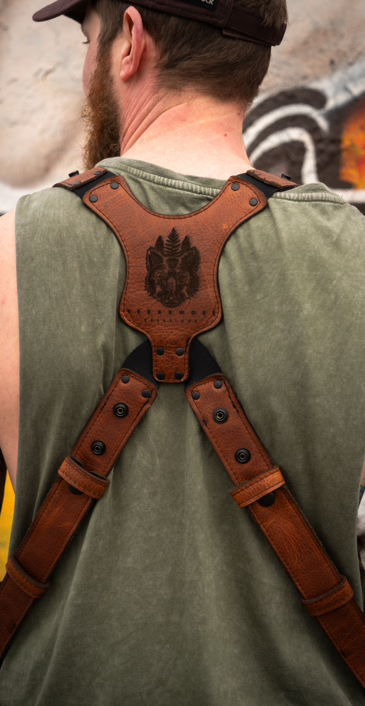 The "Minimal" holster is our most popular leather utility Item. It slims down the Utility Vest for to a more compact fit. It features the “Anti-G” elastic joints, directional locking snap on modular pockets, 4 sling clips, inner card pocket, inner stash pocket, inner passport pocket, chest strap and adjustable shoulder/side straps. Comes with 2 of the standard pockets featured in the photos.