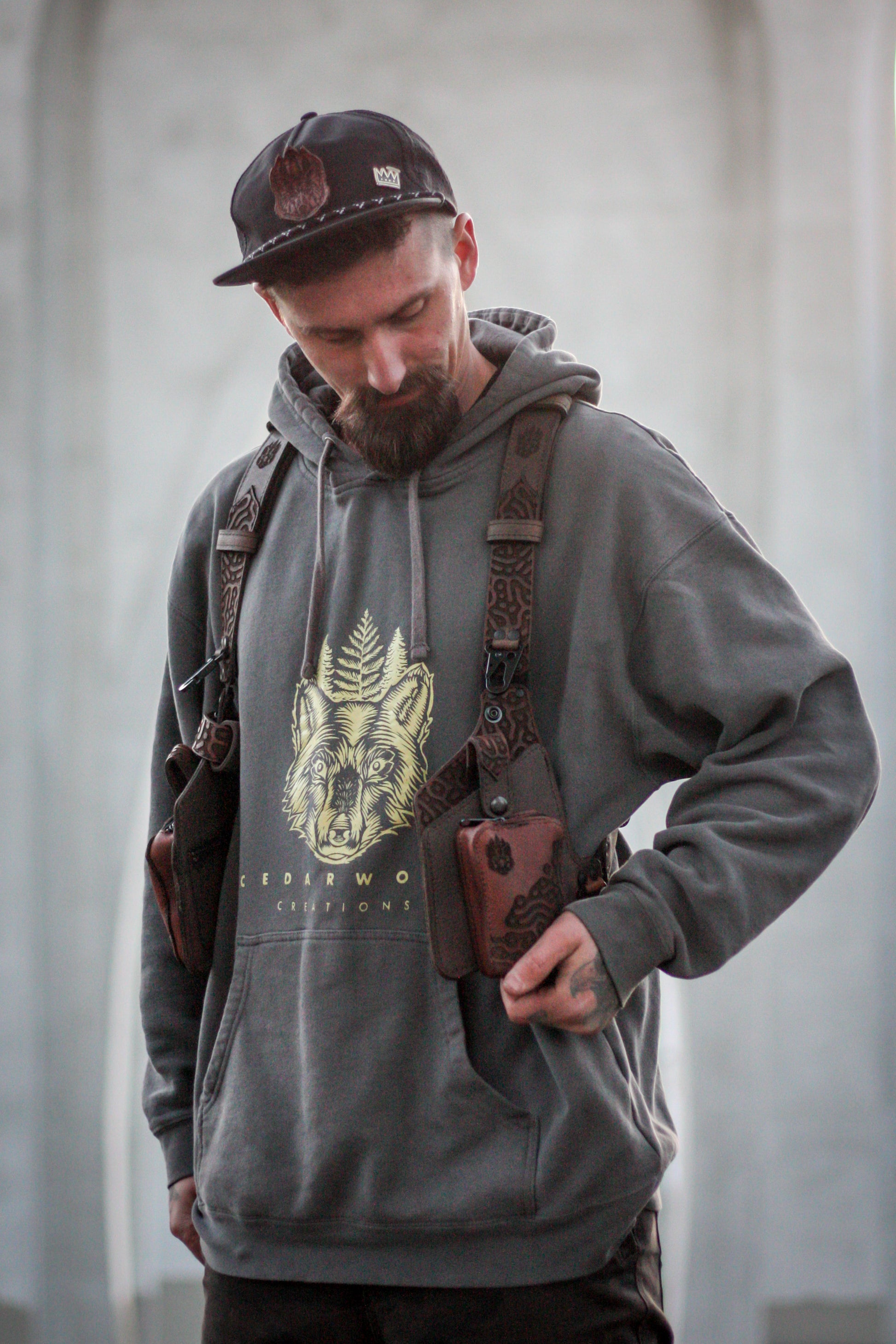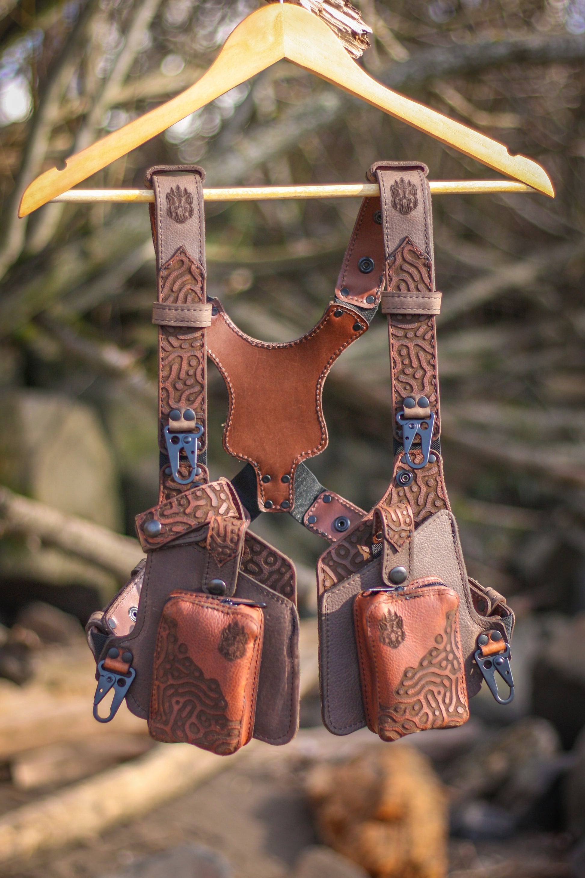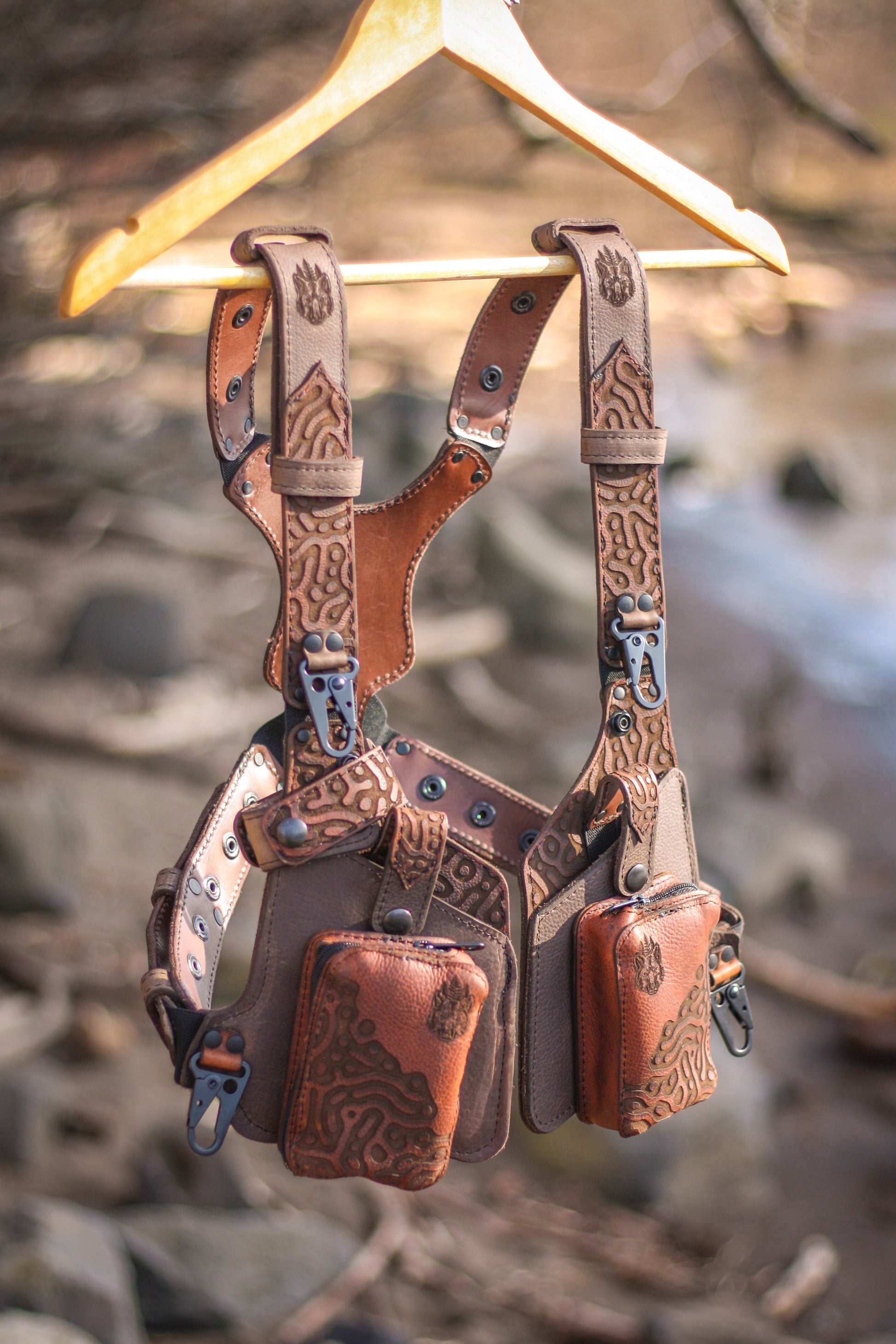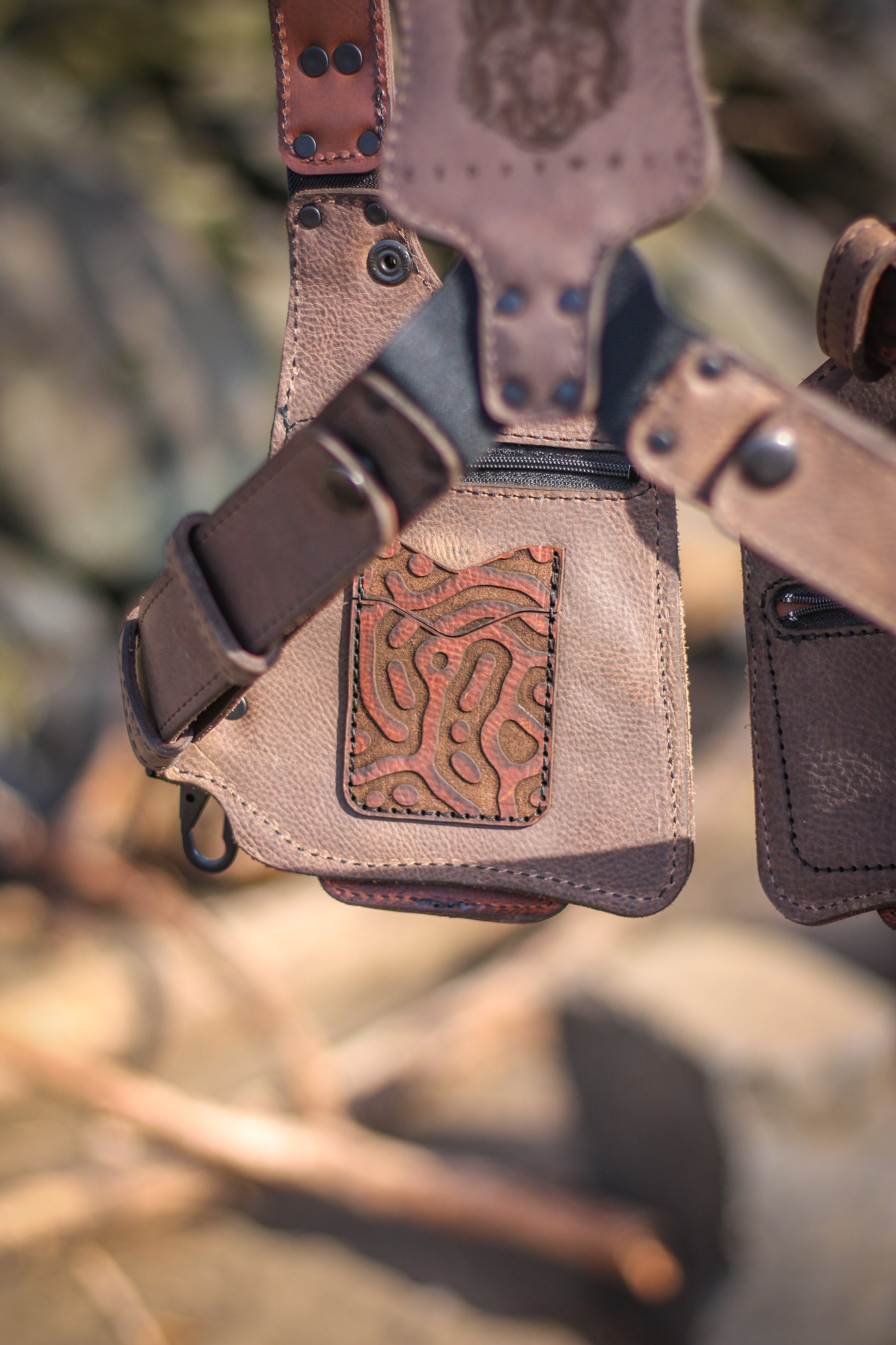 The "Minimal" holster is our most popular leather utility Item. It slims down the Utility Vest for to a more compact fit. It features the “Anti-G” elastic joints, directional locking snap on modular pockets, 4 sling clips, inner card pocket, inner stash pocket, inner passport pocket, chest strap and adjustable shoulder/side straps. Comes with 2 of the standard pockets featured in the photos.
